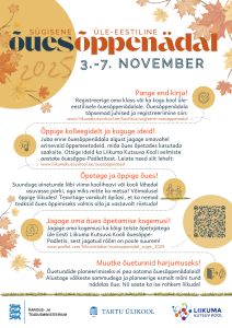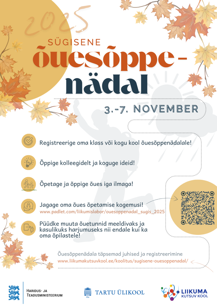 suunatud sügisese õuesõppenädala postri (pdf) ja postri, mis on suunatud teie headele kolleegidele (pdf), et motiveerida neidki õuesõppenädalast osa võtma! Soovi korral saate need kinnitada näiteks õpetajate toa seinale või jagada faili kõigi õpilaste ja ka lapsevanematega virtuaalses ruumis- Stuudiumis, eKoolis vms.
