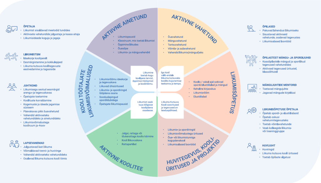 - liikuma kutsuv kool toetab koolipere liikumist aktiivsete ainetundide, vahetundide, koolitee ja kehalise kasvatuse kaudu;
