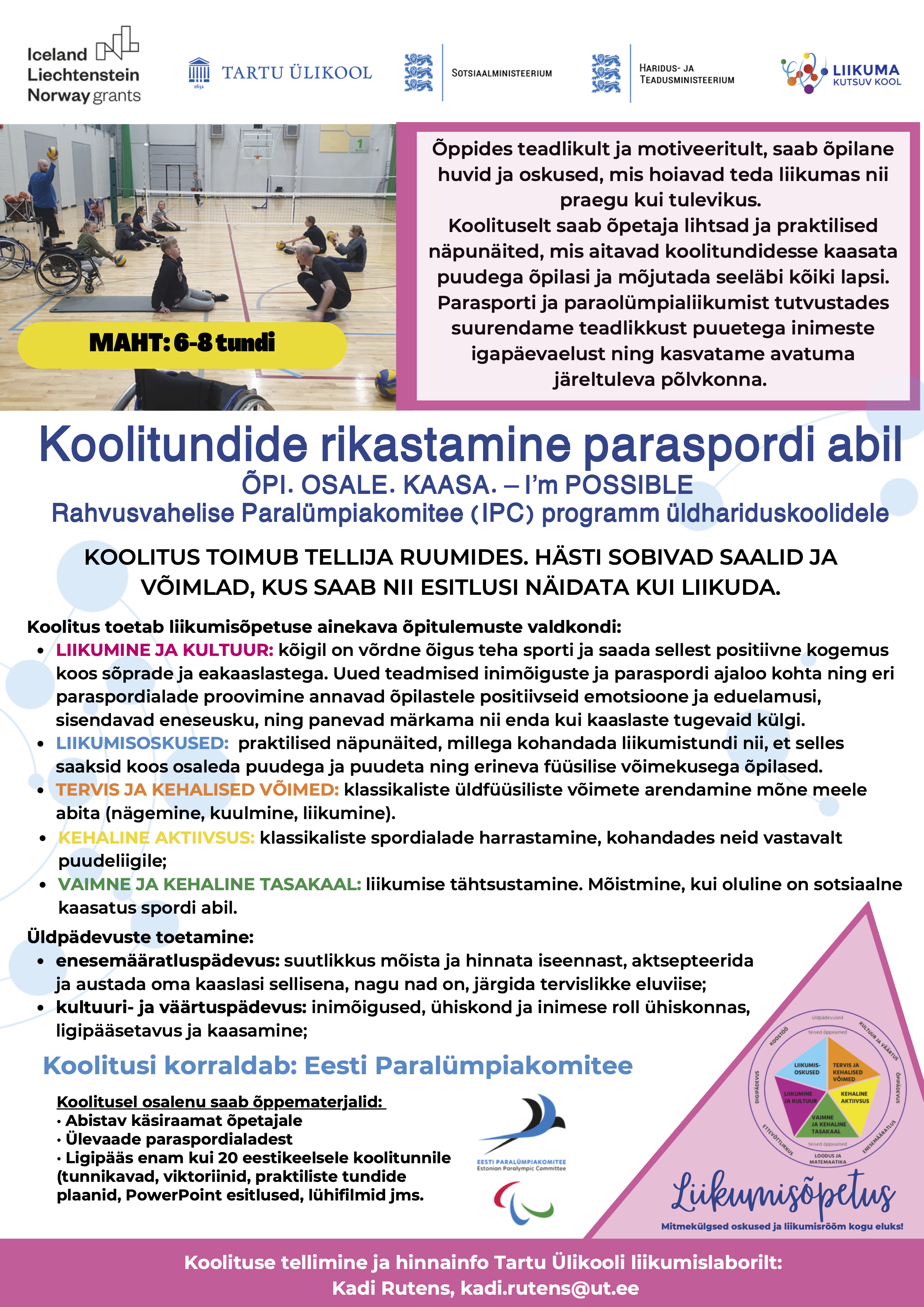 Kehaline kasvatus on uuenemas liikumisõpetuseks, mis on kohustuslik õppeaine nii põhikoolis kui gümnaasiumis. Paremaks üleminekuks uuele ainekavale pakume omavalitsustele, koolidele ja õpetajatele võimalust tellida tasu eest erinevaid koolitusi. Nende seas on nii uuest liikumisõpetusest põhjaliku ülevaateid, erinevate spordi- ja elustiilialade tutvustusi kui ka metoodilist tuge liikumisõpetuse uute valdkondade rakendamiseks ning koostöö, sisemise motivatsiooni ja kiusuvaba õhkkonna toetamiseks liikumisõpetuse tundides.